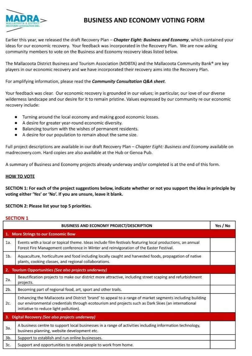 Our Community Consultation Q&A document is available HERE. It has lots of background information about the Pillar Sessions including the process for voting on the ideas that have been put up by community members in support of bushfires/COVID-19 recovery.